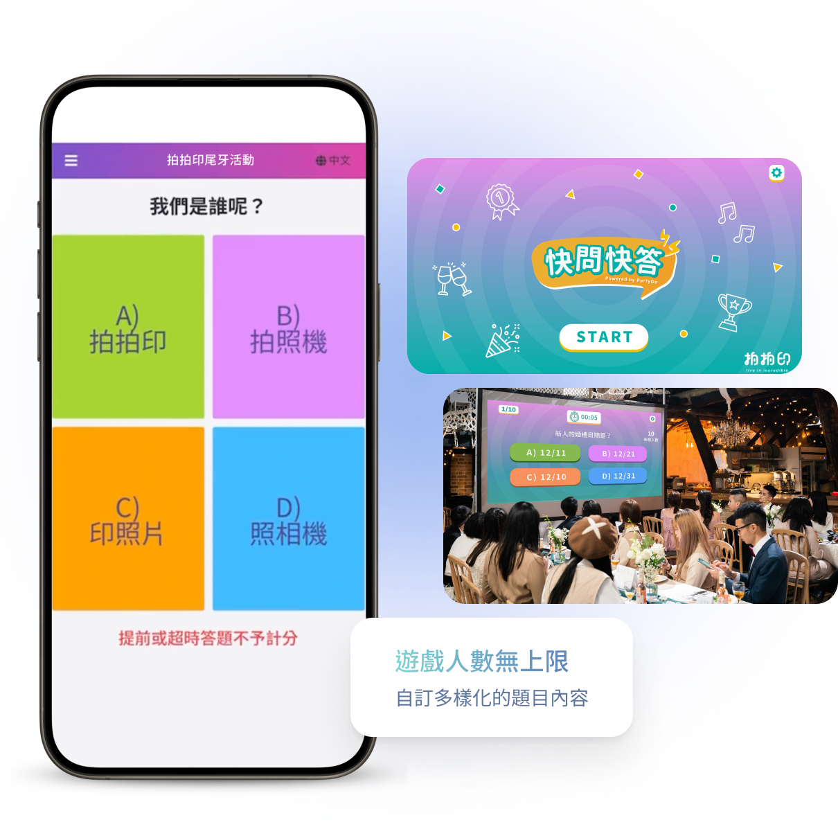 企業或活動方可在後台輕鬆自訂快問快答題目內容、每題秒數,並選擇多樣化的呈現方式,包括文字、圖片、影片、甚至音樂檔。遊戲人數無上限,每題結束後,系統會即時公布排名,並清楚呈現答對與答錯的人數。