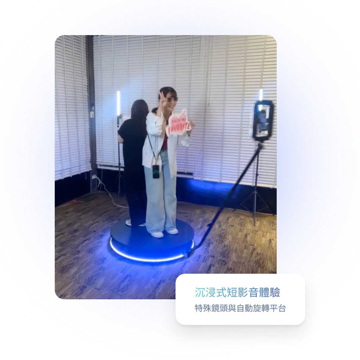 360度全景攝影呈現參與者如MV主角般的立體視角。現場參與者只需站上拍攝台,即可享受被環繞拍攝的樂趣,完美結合娛樂性與品牌行銷。