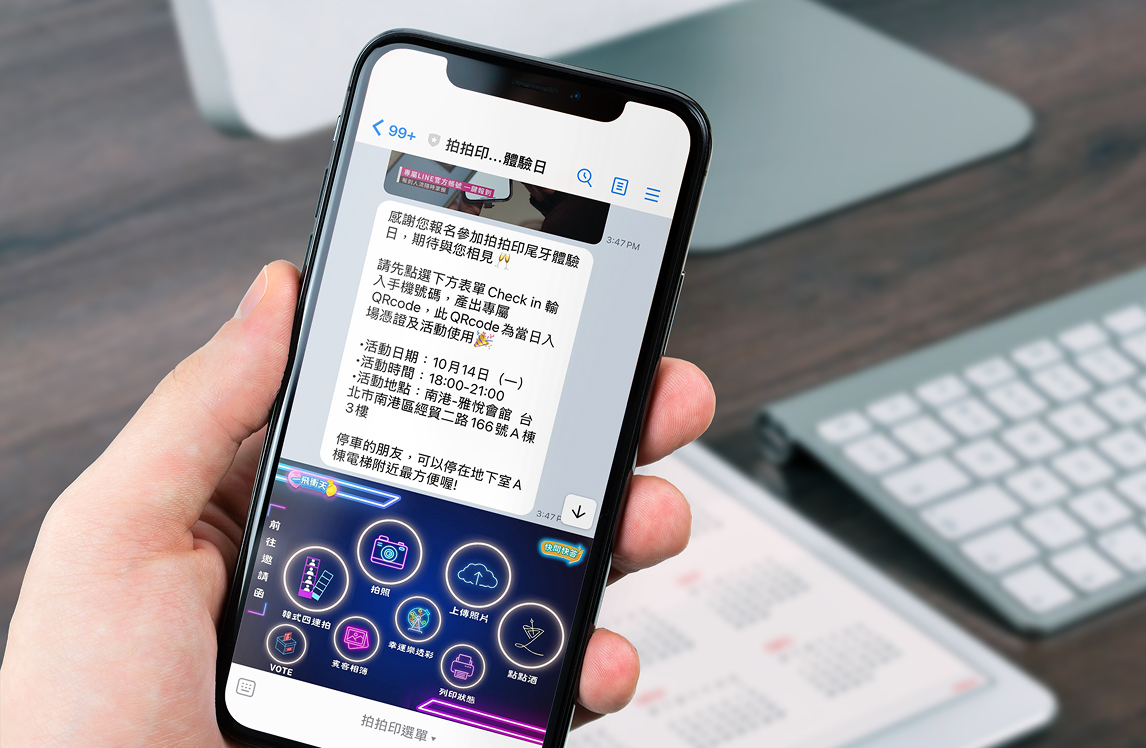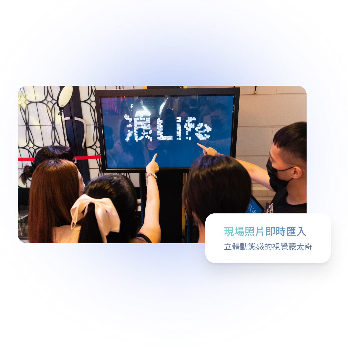 將現場拍攝的照片即時匯入系統,透過系統運算統整,自動拼接成企業主視覺或活動指定畫面。
