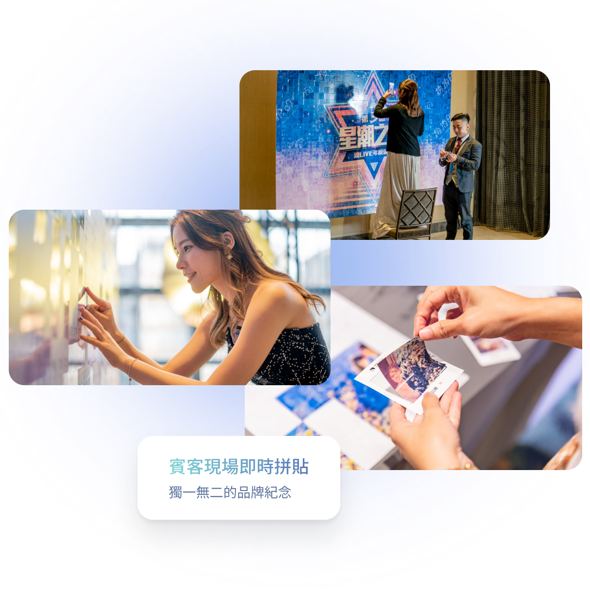 將活動現場的每一張合影,透過拍拍印的即拍即印技術,轉化為照片貼紙,結合企業 LOGO 或活動主視覺做為底圖,和參與者現場拍攝的照片製作而成的專屬拼貼貼紙,由參與者親手貼上品牌視覺牆,拼接成象徵榮耀與歸屬的「榮耀簽到牆」。每一張貼紙,都是一份回憶、一份參與,也是一份對品牌的共鳴。